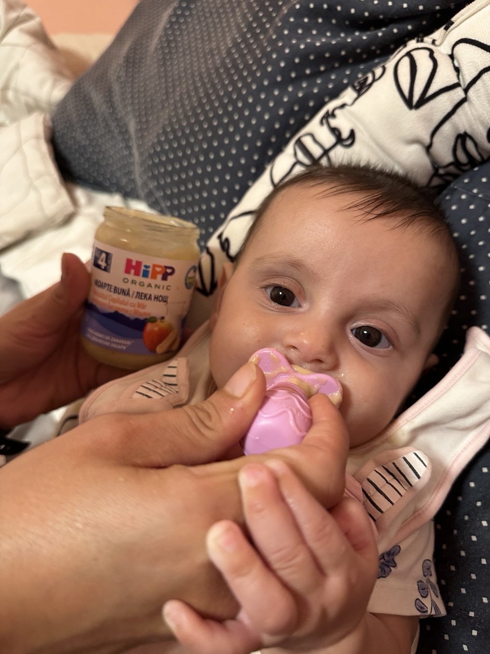 Рали облизвайки се, чака с нетърпение да отворим любимото пюре на Hipp